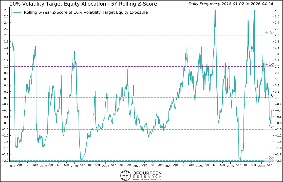This chart shows the 5-year rolling z-score of equity exposure for a 10% volatility-targeting strategy. It measures whether vol-control strategies are holding unusually high or low equity exposure relative to their own recent history. The latest reading appears near -1, meaning exposure has fallen below normal, but is not at an extreme panic/de-risking level near -2.