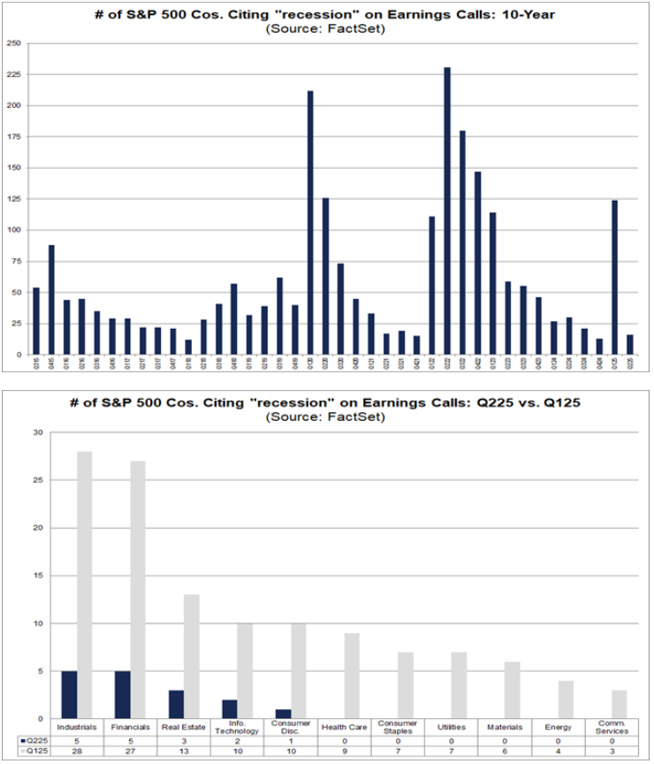 Interestingly, FactSet notes that “Overall, the term ‘recession’ was cited on 16 earnings calls conducted by S&P 500 companies during this period. This number is well below the 5-year average of 74 and the 10-year average of 61. In fact, this number reflects a quarter-over-quarter decline of 87% compared to Q1 2025, when the term ‘recession’ was cited on 124 earnings calls (March 15 through June 14).”