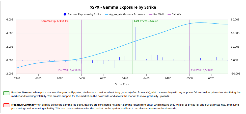 Currently, the SPX is in a positive gamma state, meaning muted volatility. Based on the current options structure, the SPX would flip to a negative gamma state (high volatility) below 6,388, just below the Put Wall at 6,400.