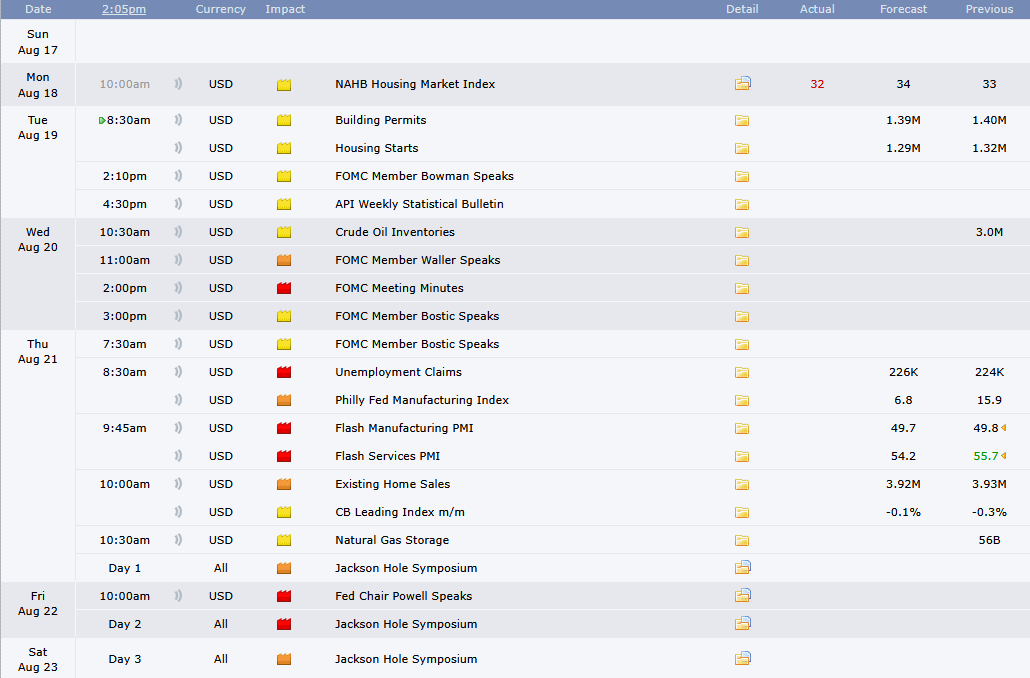 Jackson Hole is scheduled for Thursday and Friday (Powell speaks at 10:00 EST on Friday), but we will hear from Bowman tomorrow, followed by Waller and Bostic on Wednesday. Keep in mind that Waller and Bowman were the dissenting votes at the July 29-30 meeting. We’re curious if they are being trotted out to “soften” any hawkish rhetoric from the Chairman. Stay tuned.