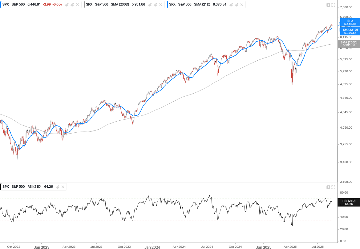 Our perspective has not changed significantly over the past few weeks. The excessive optimism we observed three weeks ago has moderated, but it continues to decline. Historically, when sentiment and technical indicators are reversing from peaks, it is advisable to follow the trend. We will monitor sentiment and short-term technical indicators, such as overbought and oversold levels, as well as trend deviations, to identify a trough and a potential reversal before issuing new buy signals. We expect a consolidation phase as our indicators move directionally toward more normalized levels. This consolidation phase may appear as a sideways market or a minor pullback, both of which would support the long-term uptrend. Our long-term indicators remain positive overall, reinforcing a constructive outlook for the market in the long term.