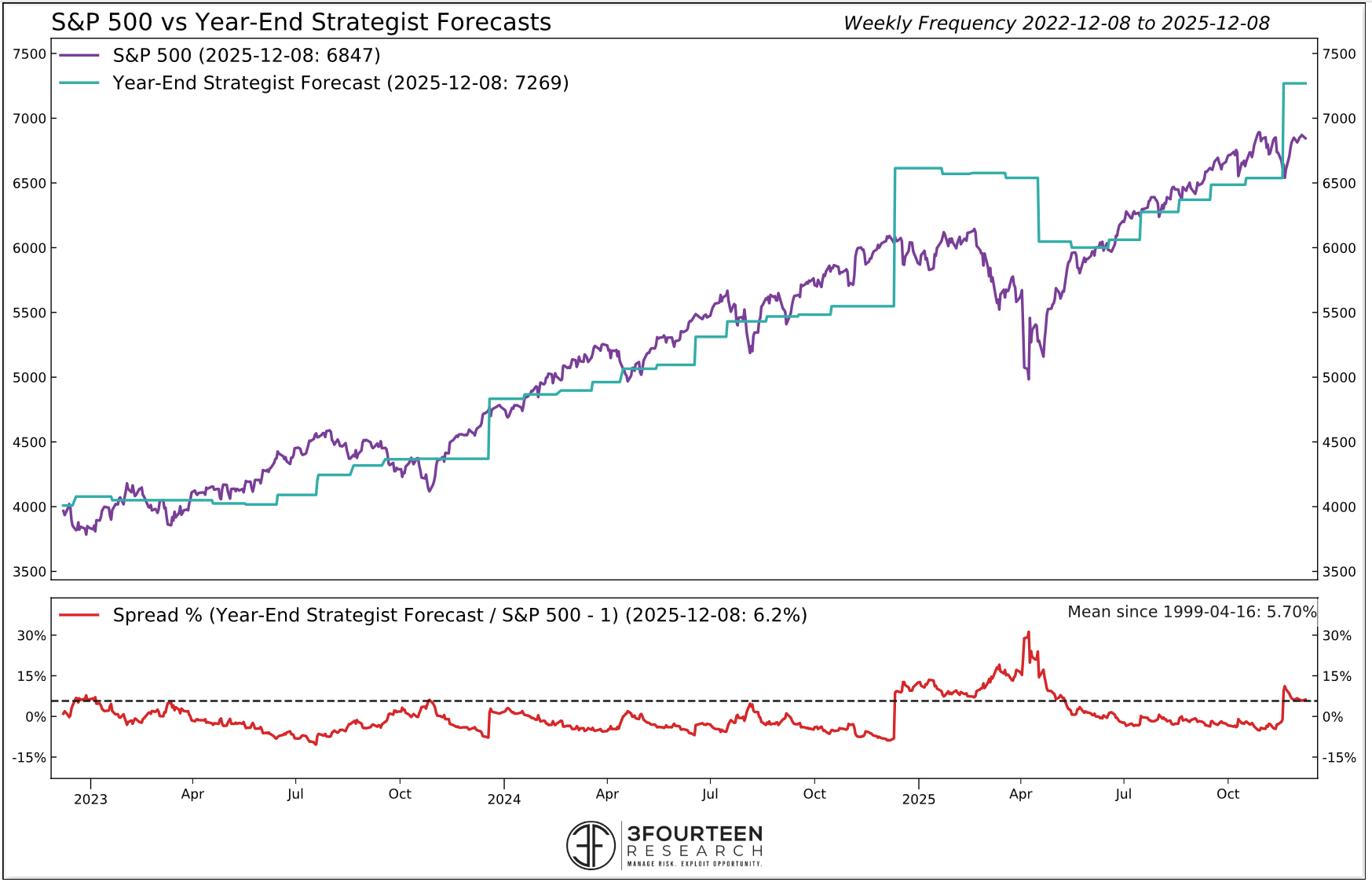 Strategist forecasts have finally caught up to the market. Historically, year-end forecasts have averaged 5.7% above the market’s price (since 1999). Currently, the spread is 6.2%. Again, not too hot, not too cold.