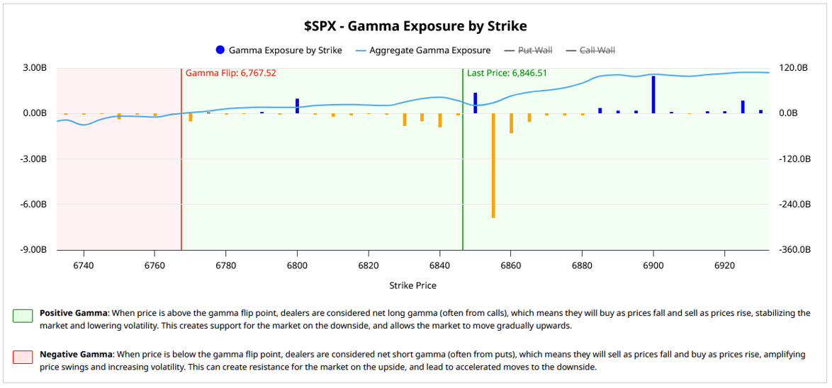 The market's gamma is currently positive, but a decline below 6,767 would put it back into negative gamma, potentially injecting more volatility into the mix.