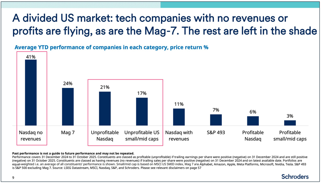 As a result, unprofitable companies are dramatically outperforming profitable ones in terms of stock price returns. As shown below, Nasdaq companies with no revenue have led the market, posting the strongest average year-to-date gains and significantly outperforming both profitable Nasdaq companies and profitable small- and mid-cap stocks. Even within the broader Nasdaq universe, firms without profits have meaningfully outpaced those with positive earnings and revenues.