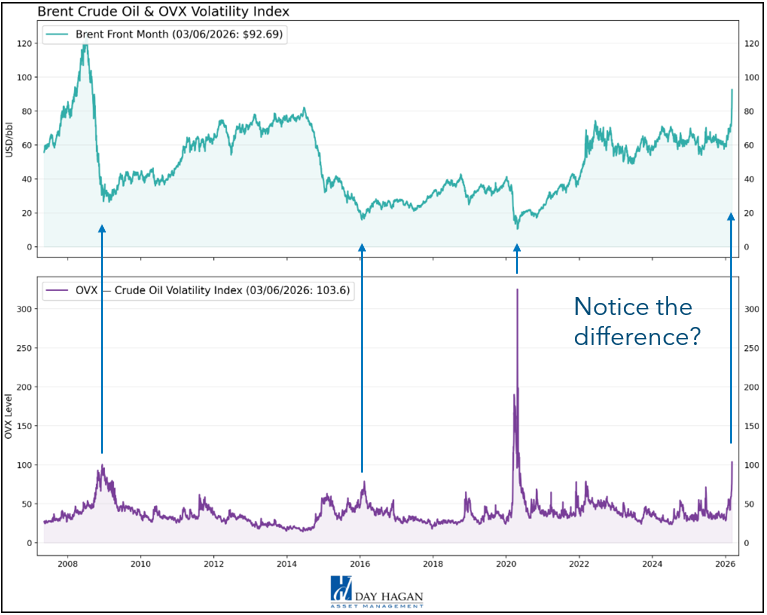 While credit spreads are behaving, equity, bond, and energy volatility measures are increasing. For example, as of last Friday, the CBOE Crude Oil Volatility Index (OVX) jumped significantly. Typically, the OVX spikes when oil prices crash, much like the VIX during equity selloffs. Seeing oil prices and oil volatility surge together is rare and signals a genuine supply shock, not a demand-driven rally.