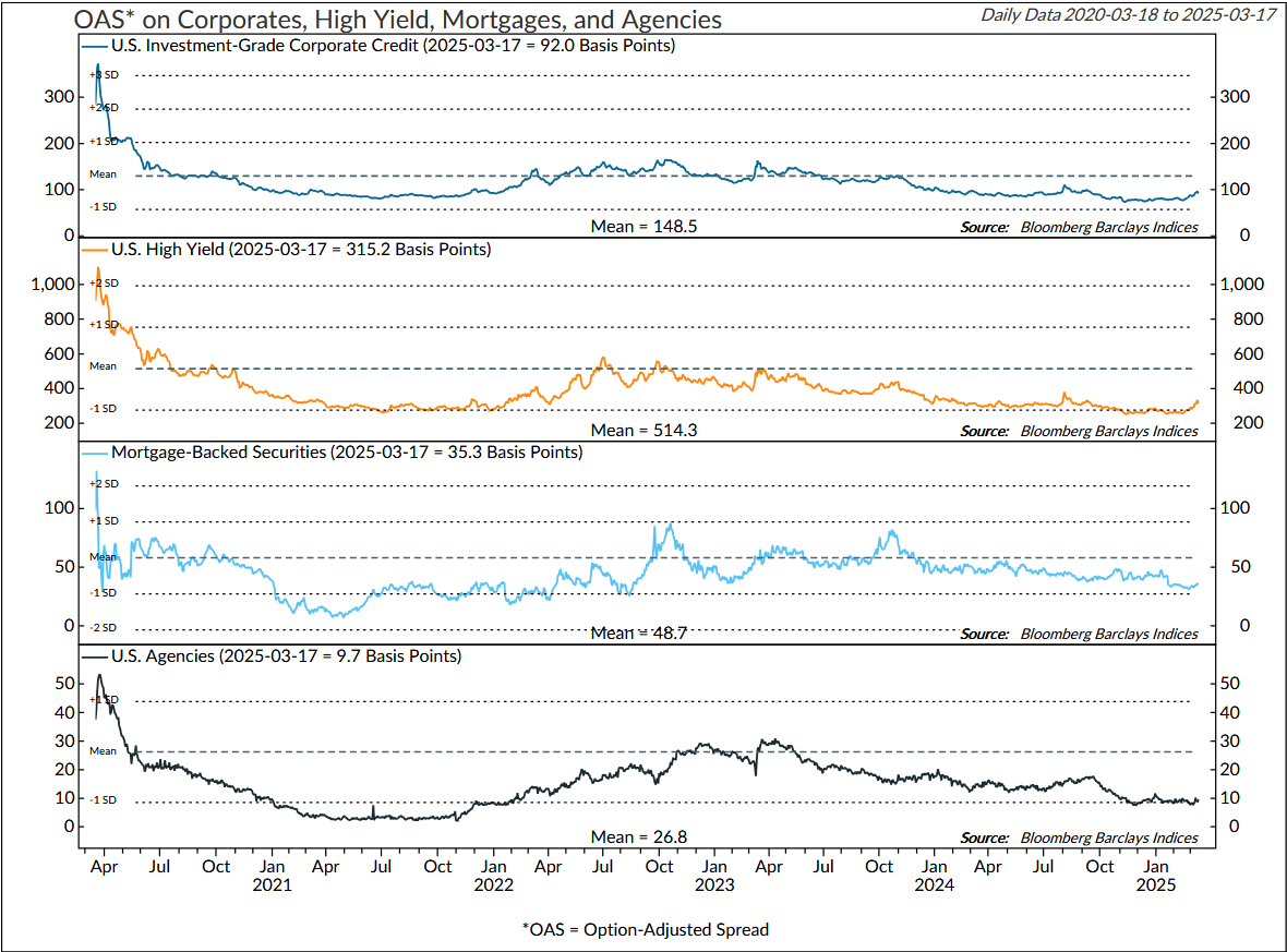 Figure 3: OAS for U.S. IG Corporates, High Yield, Mortgage-Backed Securities, and Agencies trending higher but at the lower end of the longer-term range. Caution signal.