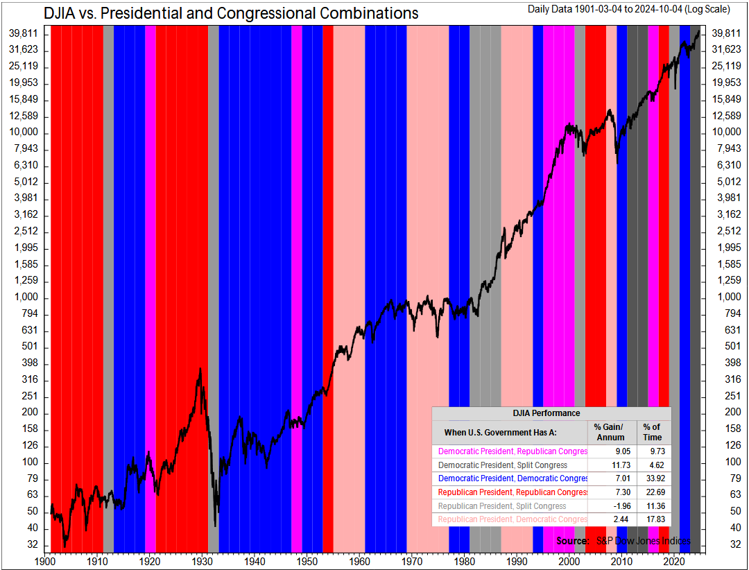 Figure 10: Looking at DJIA performance during different Presidential and Congressional Combinations, we note that a Republican President and Split Congress have historically had the lowest returns since 1901. However, that condition has only been in place 11.36% of the time, which is a relatively small sample size. A Republican President with a Republican Congress has historically been better for equities. We take these kinds of studies with a grain of salt in that it is the policy initiatives that will most influence the financial markets, and getting a bead on what each party is promoting is proving to be elusive. At this point, the most glaring and “investable” difference would be around potential tax policy changes.