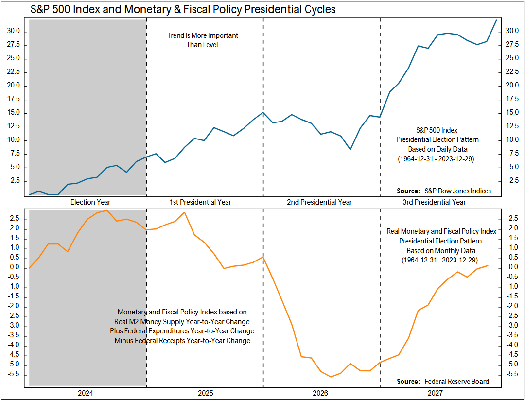 Figure 9: Historically, the monetary and fiscal policy index has risen during election years (tapering off toward the end of the year) and then entered a downtrend for the First and Second Presidential years (orange line). Note that even though stimulus declined, on average, during the First Presidential Year, the S&P 500 continued to move higher (blue line). It wasn’t until the 2nd Presidential Year that equities demonstrably weakened. We’ll be closely monitoring stimulus and liquidity indicators for signs that the credit backdrop is tightening up.
