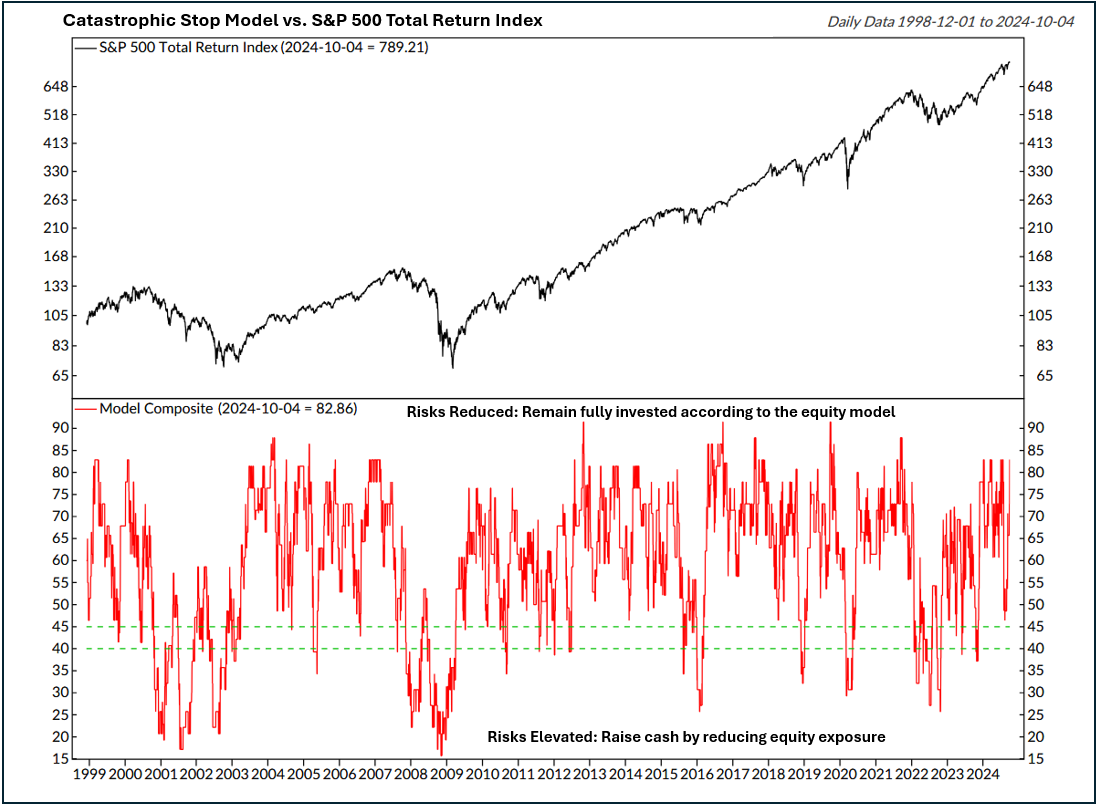 Our goal is to stay on the right side of the prevailing trend, introducing risk management when conditions deteriorate. As has been the case for all of 2024, the broader-based composite models calling U.S. economic growth, international economic growth, inflation trends, liquidity, and equity demand remain constructive. The Catastrophic Stop model is positive, and we are aligned with the message. If our models shift to bearish levels, we will raise cash.