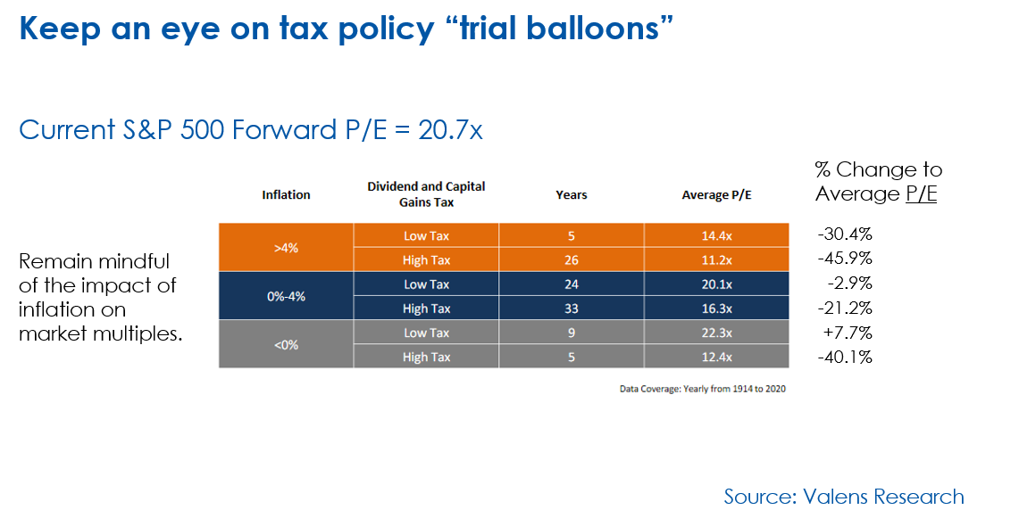 Figure 11: History shows that a “High Tax” environment does not support high valuation multiples. For example, when inflation is neutral (between 0% and 4%) and taxes are low, the S&P 500 typically trades around a 20.1x Price/Earnings ratio. However, if inflation is neutral and taxes are high, the average multiple dropped to 16.3x, which would equate to more than a 21% drop just to the multiple reset.