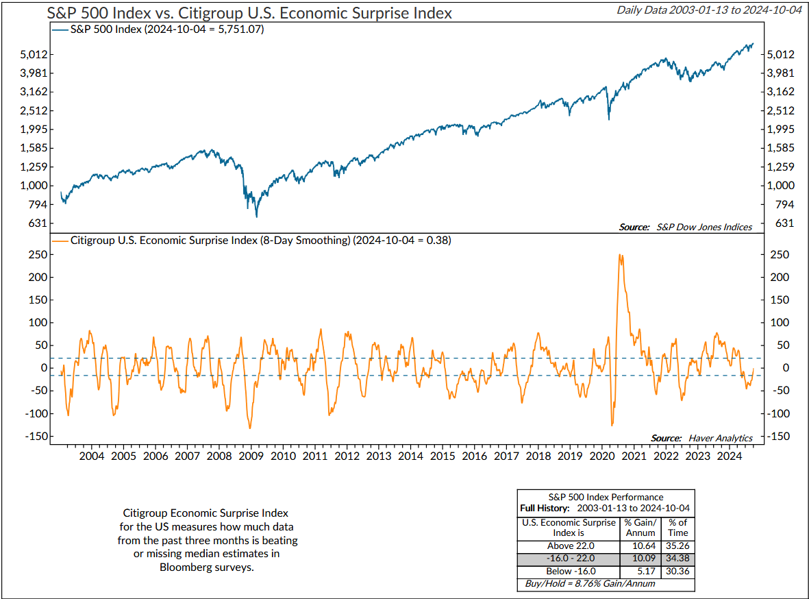 We note that the U.S. Economic Surprise Index has moved above 0. This shows that economic releases over the past three months have met expectations. This is a positive development.