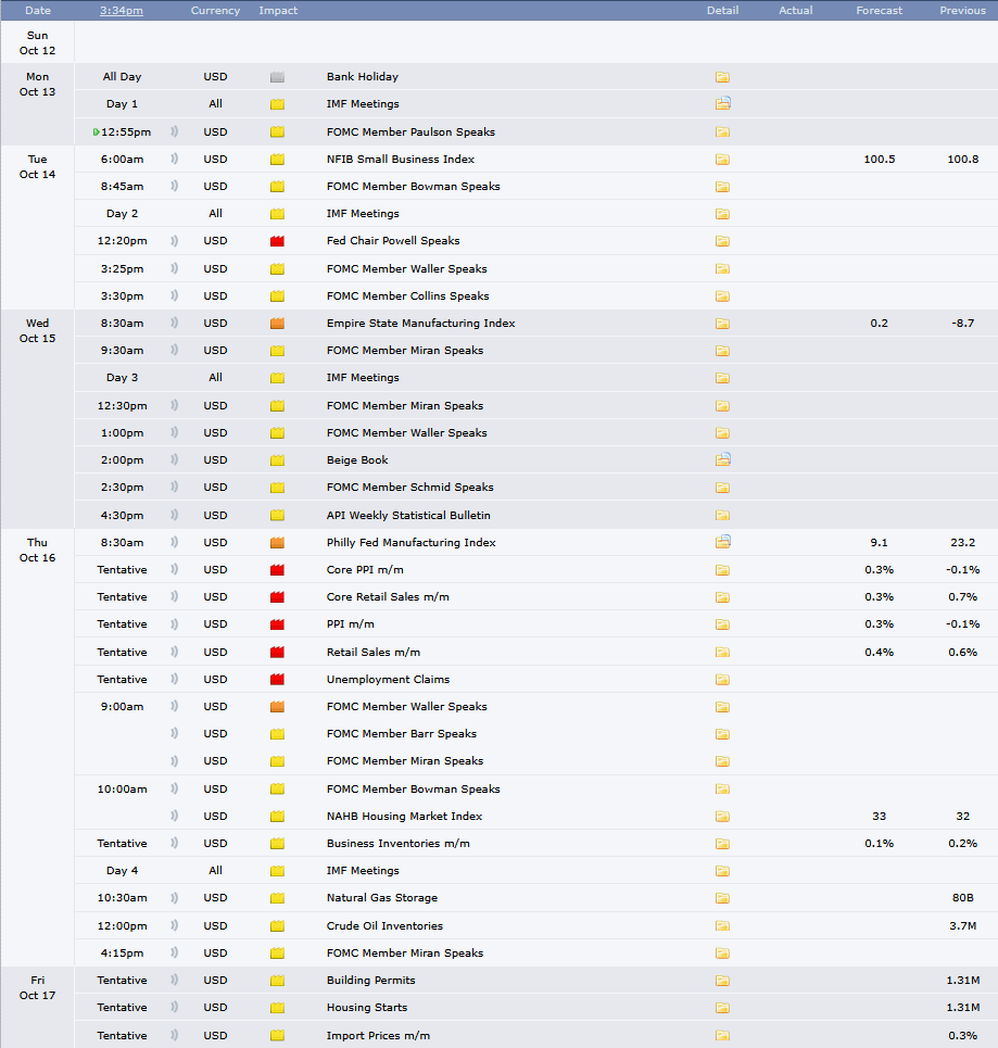Bottom Line: Global markets are facing renewed volatility due to the possibility of “Trade War 2.0.” The tariffs may threaten key U.S. tech and manufacturing supply chains, with sectors from semiconductors to autos bracing for disruption. Investors are now watching for a possible Trump-Xi meeting, while earnings and data will dominate the week. Major banks will report results, offering insight into loan demand, credit quality, and economic momentum, while the potential release of PPI and retail sales tests inflation and consumer resilience amid higher import costs. Fed Chair Powell’s Tuesday speech may shape expectations on policy risks from tariffs and the shutdown. Tech and healthcare earnings will further gauge economic and geopolitical stress.