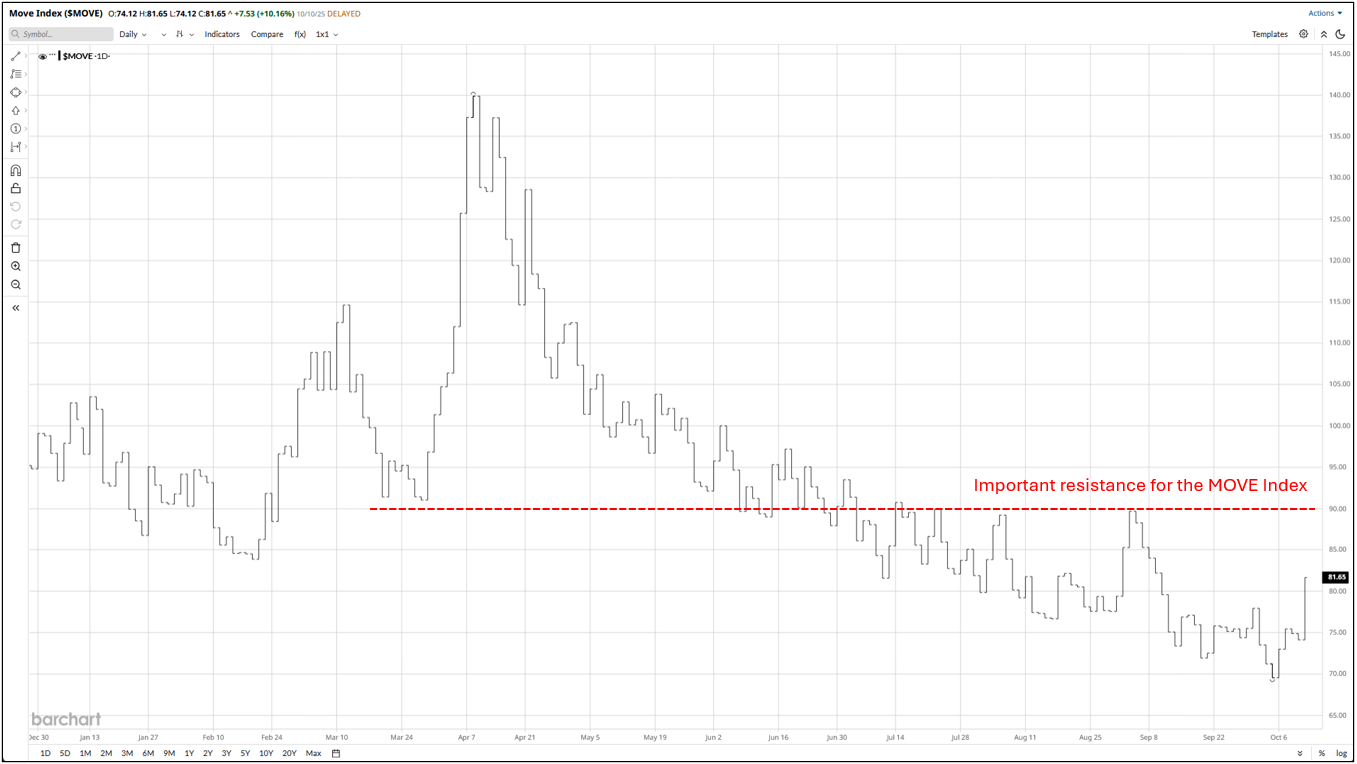 Figure 4: The MOVE Index (Merrill Lynch Option Volatility Estimate) measures expected volatility in U.S. Treasury markets, reflecting investor uncertainty about interest rates and bond market risk. It moves inversely to equity prices. This needs to hold.