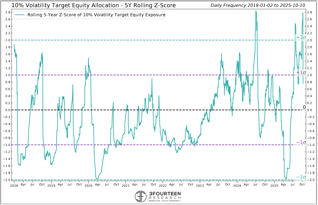 Figure 10: Positioning indicators and composites remain elevated, but as shown by the vol-targeting equity allocation chart below, some of the froth has already been worked off. You can see where positioning was at the 2020, 2022, 2024, and 2025 lows. These charts are very helpful in identifying the level of potential demand.