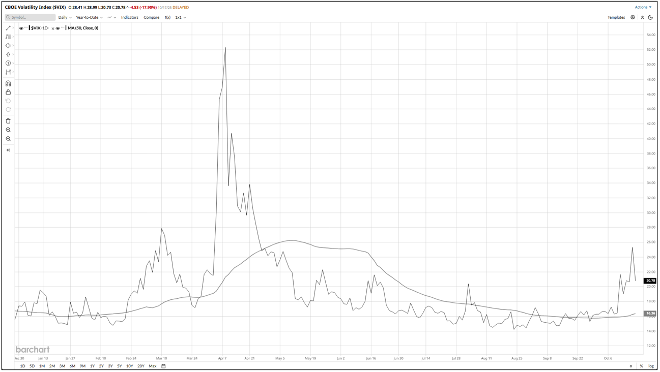 Last week, the CBOE VIX surged into the high-20s amid a drop in the S&P 500 on fears of U.S.–China trade escalation and a pending government shutdown. At the same time, the CBOE VVIX — the “volatility of the volatility” index — also climbed, signaling rising uncertainty around future volatility and heightened demand for VIX option hedges. Historically, such VIX spikes (above ~20 and jumping > 20% above recent averages) have often preceded an equity rebound: one study found the S&P 500 rose over the next month in ~65 % of similar cases. ( Source: Tastylive, 2024)