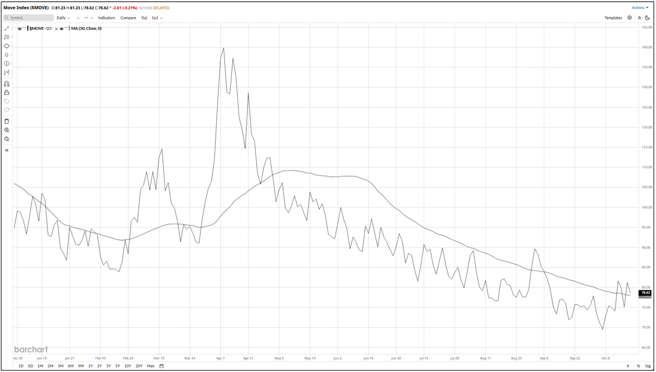 The MOVE Index appears to be peaking and edging lower — a sign that rate expectations are stabilizing. Traders seem increasingly confident that the Fed’s likely path of gradual rate cuts in 2025–26 is now priced in. As Treasury volatility subsides, liquidity and confidence are returning, encouraging flows back into risk assets such as equities and credit. Historically, when the MOVE rolls over, the VIX often follows, paving the way for equity stabilization and potential rallies.