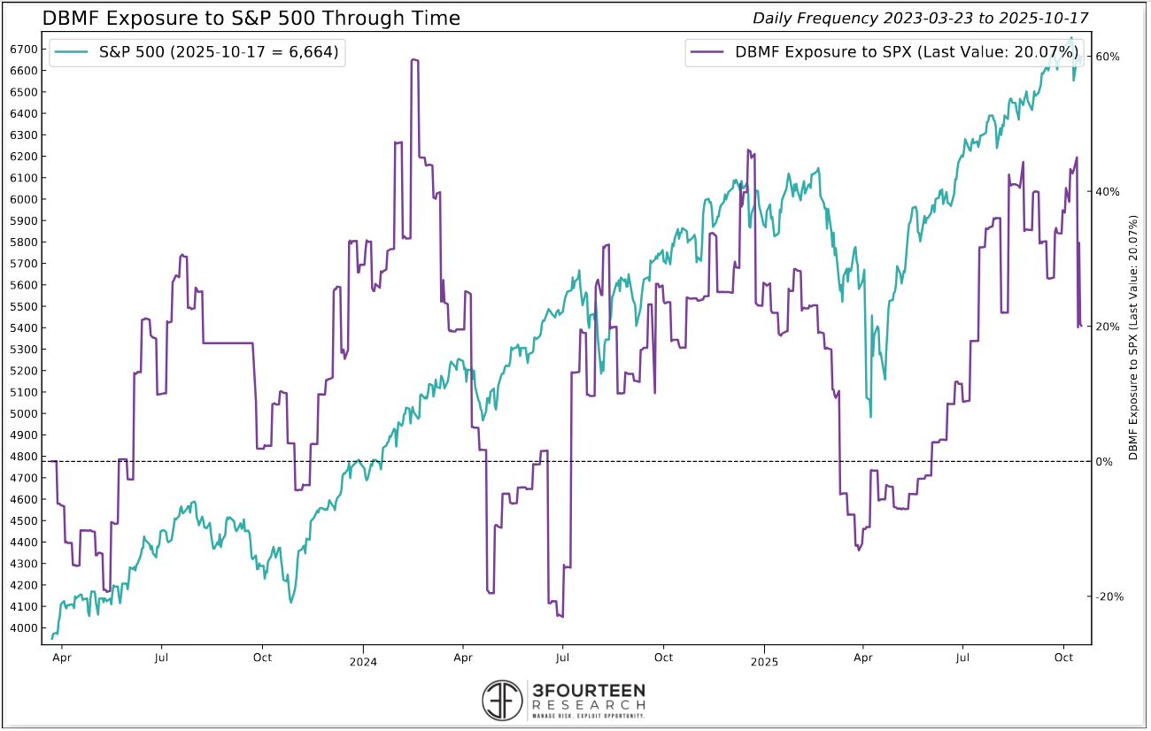 In recent weeks, DBMF’s daily transparency feed has shown declining equity and bond exposure and a shift toward long USD/short commodities, consistent with a more cautious, defensive macro regime.