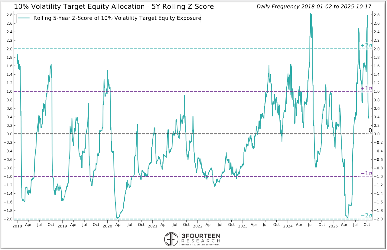 Figure 9: Positioning indicators and composites have moved to more neutral levels. The 10% Volatility Targeting equity allocation chart below shows that much of the froth has already been worked off. You can see where positioning was at the 2020, 2022, 2024, and 2025 lows. These charts are very helpful in identifying the level of potential future demand.