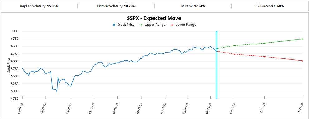 The expected range for the SPX heading into the 9-19 expiration is between 6,239 and 6,525. Today’s decline is within expectations. While it may feel worse, as of this writing, the SPX is just -1.84% below its all-time high (6,388 vs. 6,508).