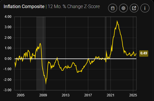 The inflation composite below is based on commodity prices, PPI, hourly wages, and the CPI. While the composite has increased recently, levels are still likely to support a Fed cut in September of at least 25 bps. (Source: Street Stats)