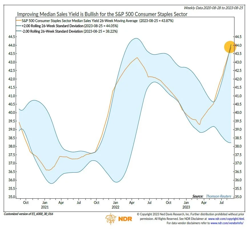 Consumer Staples’ allocation increased in August, but it remains an underweight position. It was the second worst-performing sector in August. On a fundamental basis, about half of the indicators are positive for the sector. Valuation (median sales yield, chart left) improved to a bullish level, joining credit conditions, consumer purchasing power, and economic surprises. However, most price-based measures remain bearish.