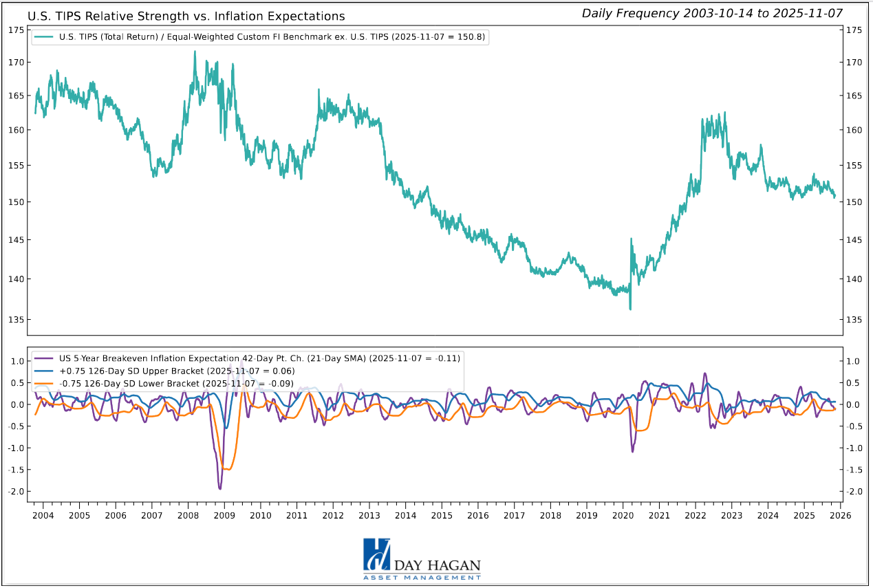 U.S. Treasuries: U.S. long-duration Treasuries positive indicators include technical moving average cross signals, improving momentum, favorable positioning versus inflation expectations, and firm relative strength against credit risk. These factors point to constructive demand and a supportive quality bid. Offsetting this, relative strength versus the equity market is weak, indicating capital preference for risk assets over duration. Overall, the composite suggests a positive but not uniform profile: technical and macro-risk indicators are aligned, while cross-asset allocation pressures temper the signal. We are currently overweight at the shorter end of the curve.