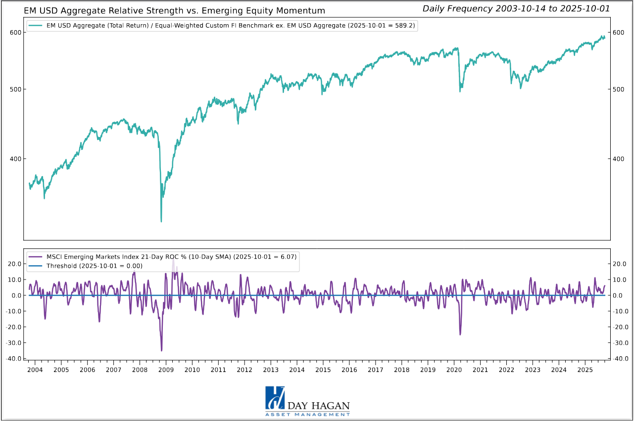Emerging Market Bonds: The EM composite model is uniformly positive. Strength is evident based on the relative EM currency basket, emerging equity momentum, commodity market performance, and the absolute moving average cross, with additional confirmation from the relative strength slope indicator. This alignment indicates broad technical support, favorable macroeconomic support, and resilience across asset class comparisons. With no offsetting negatives, the signal set underscores strong relative positioning for EM USD debt, reflecting synchronized support from currency, equity, and commodity dynamics. We remain modestly overweight.