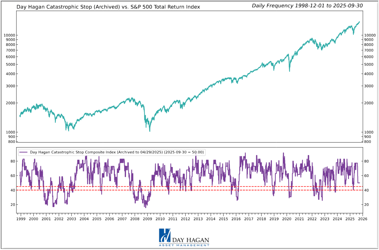 Our goal is to stay on the right side of the prevailing trend, introducing risk management when conditions deteriorate. Currently, the uptrend remains intact. The broader-based composite models calling U.S. economic growth, international economic growth, inflation trends, liquidity, and equity demand remain constructive. The Catastrophic Stop model is positive, and we are aligned with the message. If our models shift to bearish levels, we will raise cash.