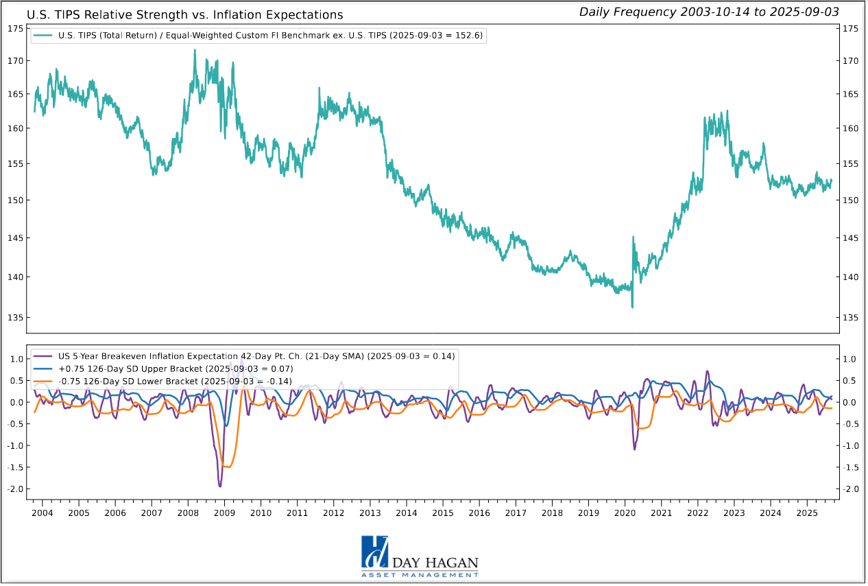 U.S. Treasuries: Shorter-duration Treasuries are favored. U.S. long-term Treasuries are exhibiting improving relative strength compared to the equity market, while credit risk proxies (CDS) are improving, indicating risk-off demand and a quality bid. Negative signals include relative strength, technical cross-measures, and inflation expectations, indicating potential headwinds. Neutral: momentum-based technicals are flat. Overall, the model confirms a mixed regime—defensive appeal improving against risk assets and credit, while inflation dynamics and trend overlays constrain upside. We remain overweight in shorter-duration assets and are neutral in longer-duration assets.