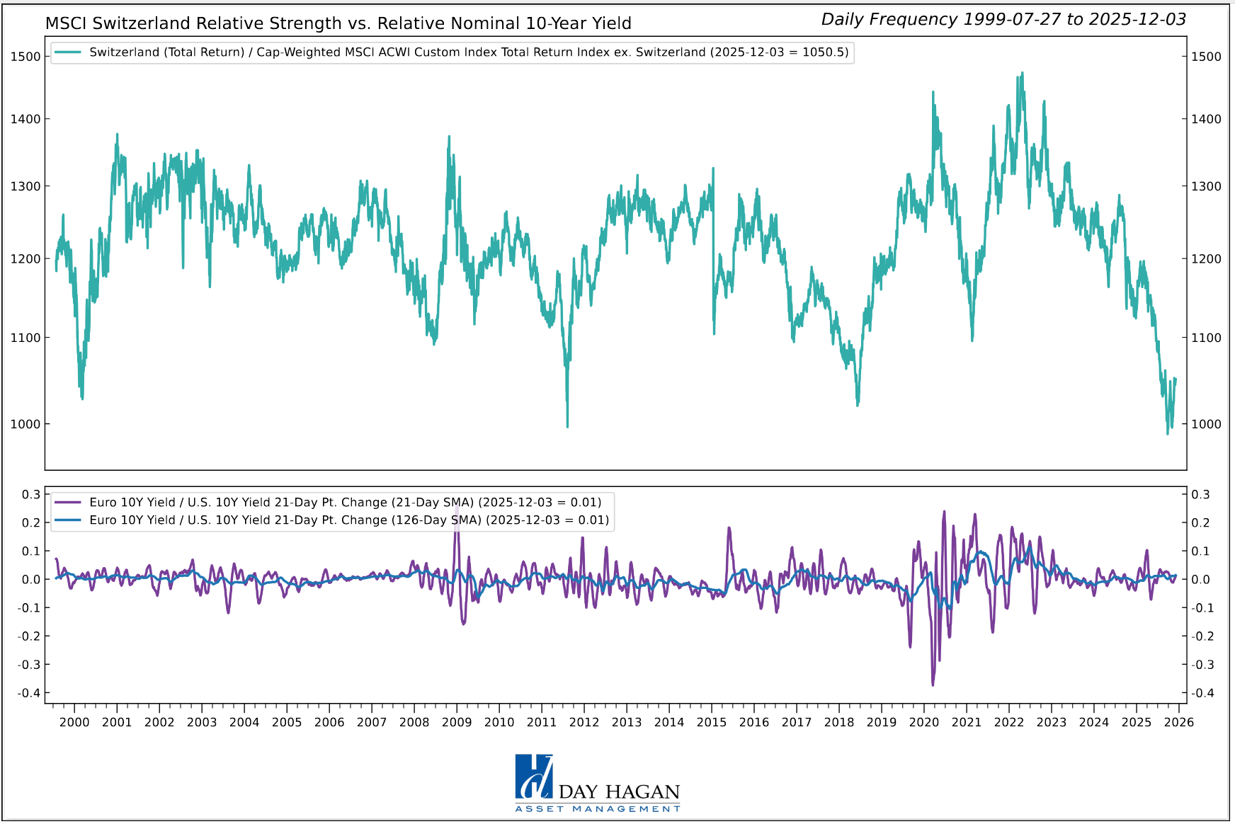 Switzerland: Bearish signals dominate the long-term view, including a negative moving average cross signal and a bearish slope in relative strength momentum, indicating a lack of sustained outperformance against global peers. Furthermore, fundamental pressures are evident with bearish readings on the relative dividend yield and the relative nominal 10-year yield, suggesting unattractive valuation or interest rate comparisons. Conversely, several internal metrics are bullish, indicating underlying market strength. A positive 200-day moving average breadth and strong cross-sectional 50-day price momentum suggest a broad-based participation in recent positive price movements. Relative ETF fund flows are neutral, implying no strong immediate directional bias from institutional capital. Overall, the data suggest a market with robust internal dynamics but challenged by valuation and macro factors, warranting a selective and cautious approach to allocation.