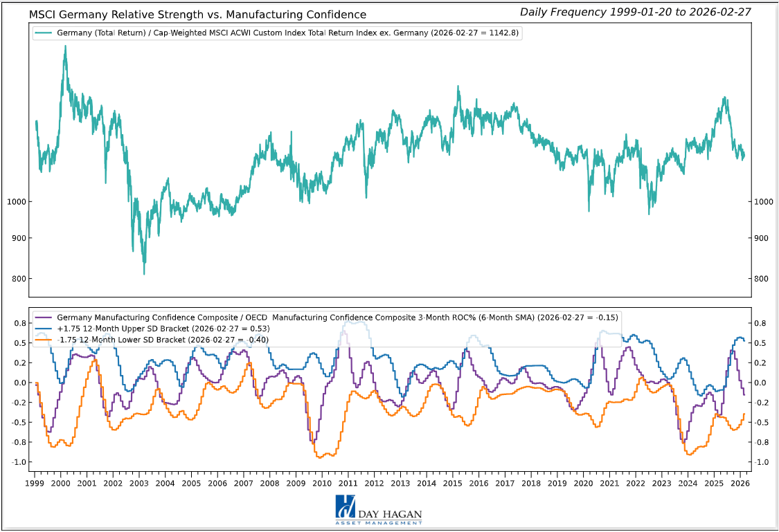 United Kingdom: The U.K.’s relative strength shows constructive internal price action alongside notable cross-asset headwinds. On the positive side, the Moving Average Cross is bullish, signaling improving trend alignment. Cross-Sectional Price Momentum is also favorable, indicating broad participation and near-term leadership within the market. On the negative side, several external factors weigh on the outlook. Performance relative to the GBP-USD exchange rate is bearish, suggesting that currency dynamics are not supportive. The ACWI Valuation Scorecard is unfavorable, pointing to less compelling relative pricing. DSI sentiment is negative, indicating positioning may be stretched. In addition, U.K. option-adjusted spreads are bearish, reflecting tighter credit conditions and elevated risk premiums. Overall, price momentum is constructive, but valuation, sentiment, currency, and credit inputs introduce meaningful constraints.