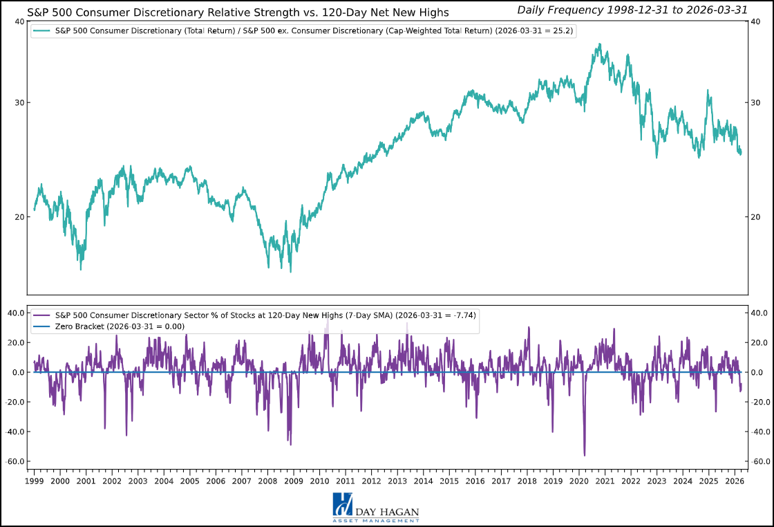 Figure 1: The Consumer Discretionary sector is in minor oversold territory, with relative net new highs having plummeted. A reversal back above the 0% bracket would generate a buy signal, potentially indicating renewed investor demand. (Note: All charts are proprietary from Day Hagan Asset Management.)