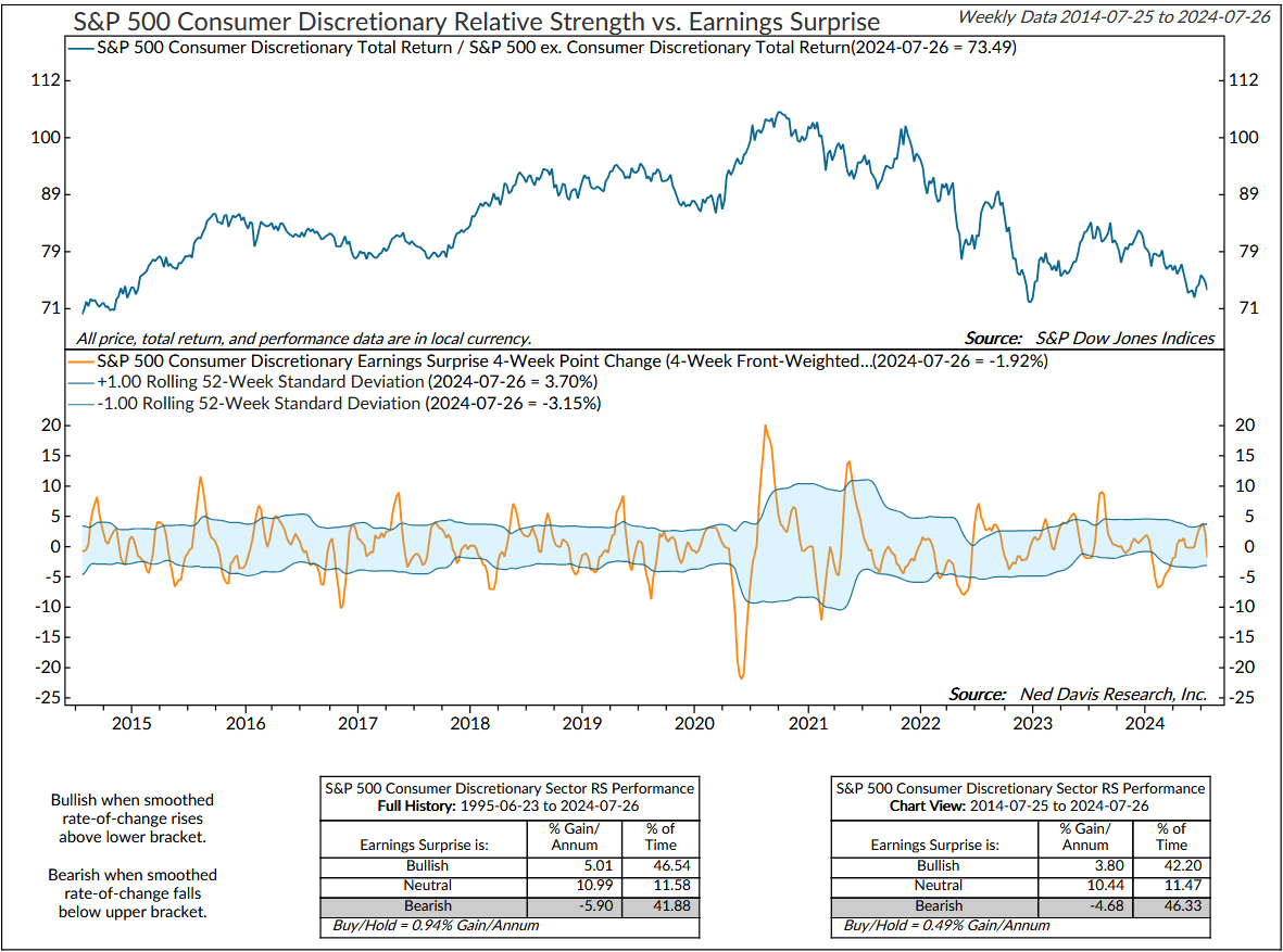 Figure 6: Earnings surprises have turned negative for consumer discretionary stocks, urging caution.