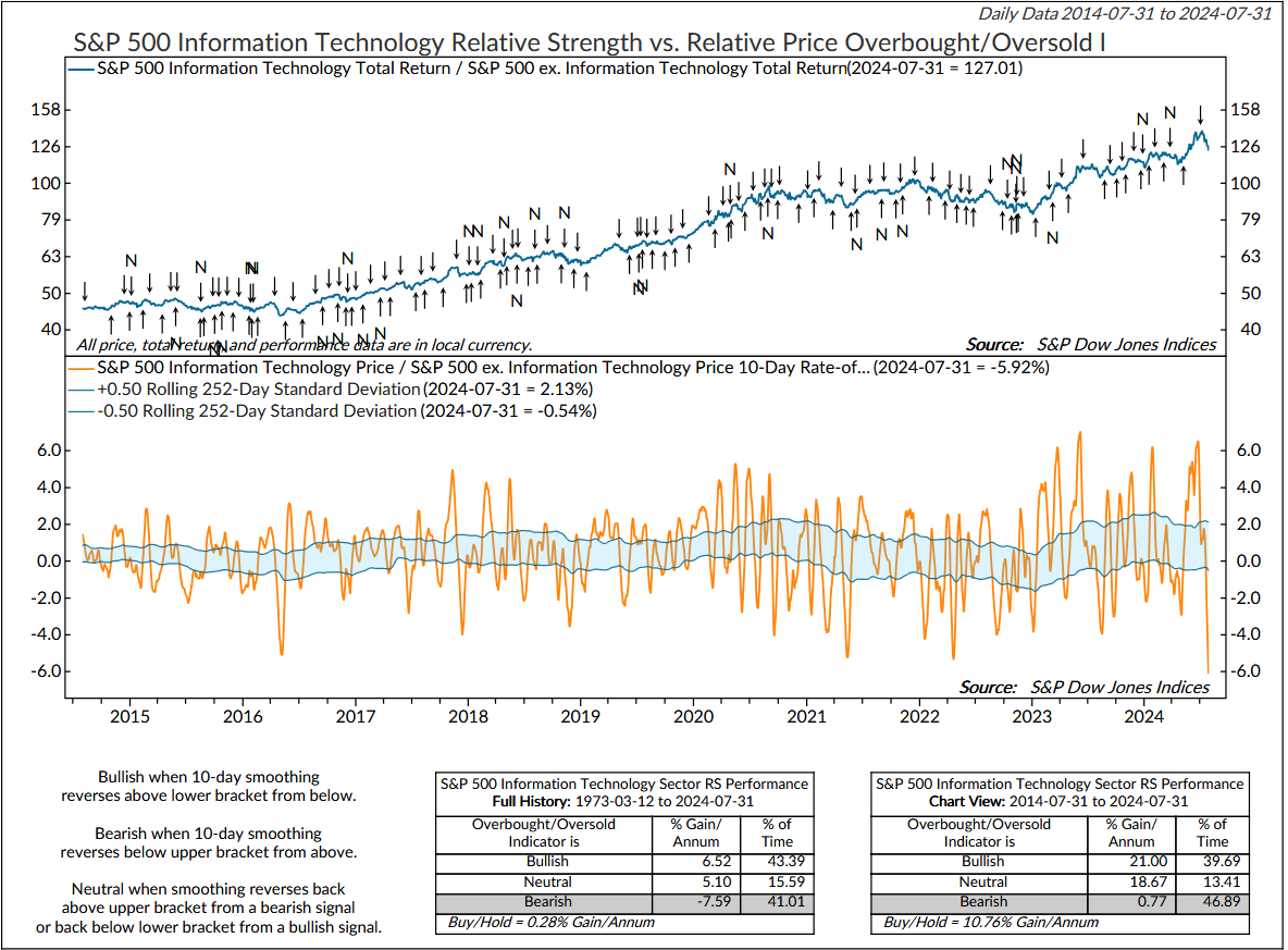 We reinvested the proceeds into the Invesco S&P 500 Equal Weight ETF (ticker: RSP). The change effectively reduced information technology sector exposure to just above the benchmark level while simultaneously increasing sector exposure to smaller and midcap companies within the S&P 500. Entering July, we were heavily invested in the tech sector due to positive internal and external indicators. The number of new highs had increased, and other breadth indicators were close to signaling a buy. We suggested that it might be time for the troops to support the generals. We mentioned last month that the sector was overbought, but sometimes overbought conditions can persist. However, at that point, even though a clear reversal had not happened, a few of our short-term indicators were showing signs of exhaustion. Our model indicated that there was less support for the bullish trend, so being significantly overweight was no longer justified. We noted that the positioning for upside in the MAGS was overextended, as investors were fully committed to those stocks.