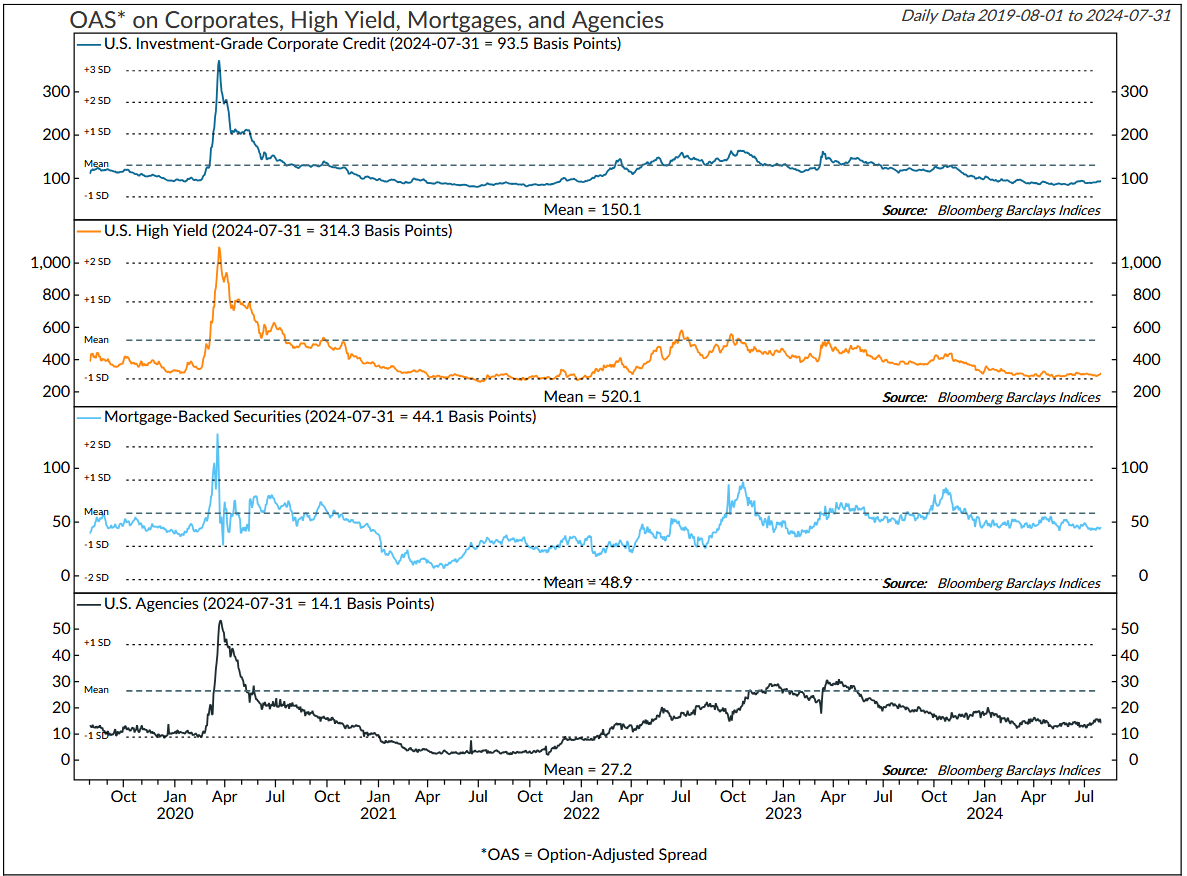 Figure 5: OAS for Corporates, High Yield, Mortgages, and Agencies remain below long-term averages.
