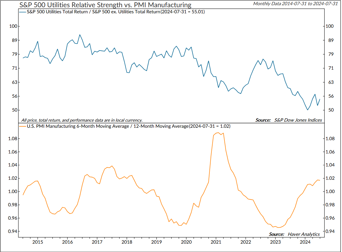 Figure 16: The Utilities sector has a negative correlation to U.S. Manufacturing PMI trends. (Higher PMIs = stronger economy = potentially higher interest rates = competition for yield-sensitive investors holding utility stocks.)