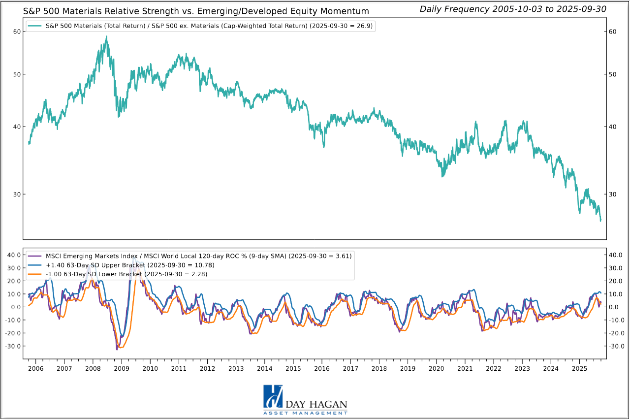 Figure 9: Historically, better equity performance in Emerging Markets has been bullish for the Materials sector. However, there are signs that DM is gaining ground and EM is rolling over.