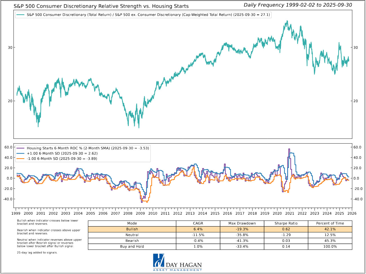 Consumer Discretionary: Positive indicators for the Consumer Discretionary sector include short- and intermediate-term moving average crosses, relative price momentum, overbought/oversold positioning, net new highs, consumer credit trends, and housing starts. These highlight constructive technical and macro underpinnings. Negative indicators were tied to price deviation from trend (indicating an extended upmove), relative forward valuations, and the sticky 30-year Treasury yield, signaling pressure from valuation and rate sensitivity. Discretionary spending registered neutral. Overall, the mix demonstrated strong technical support, albeit tempered by valuation and macroeconomic headwinds. We remain neutral.