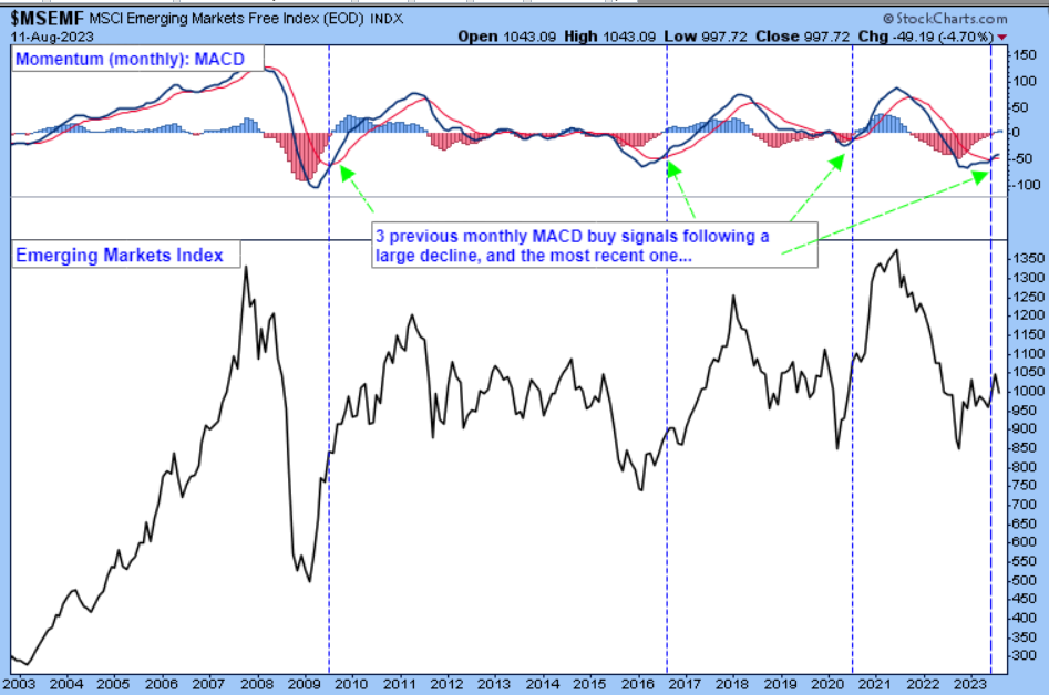 Figure 3: Emerging Markets Index with Momentum – monthly data. | While there was some hesitation following each of the previous monthly buy signals—which appears to be occurring this time—sharp gains were realized over time.